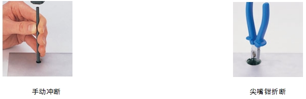 手動沖斷鋼絲螺套安裝柄時,將手動沖斷器對準安裝柄,用200g左右的榔頭猛打一下即可去除,對于18×2.5以上的粗牙鋼絲螺套和14×1.25以上的細牙鋼絲螺套,用尖嘴鉗上下彎曲亦能將安裝柄去除,還有助于防止跳牙,見下圖。